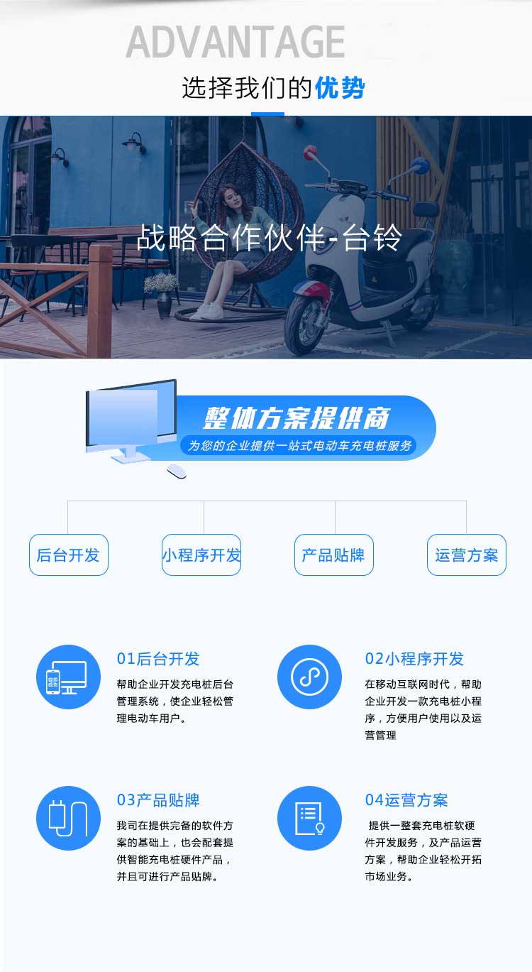動車、智能充電樁、智能充電柜、電動車銷售與售后平臺,致力于打造一套完整的電動車生態(tài)圈,為客戶提供電動車從購買到使用、充換電及售后乖全方位的產(chǎn)品體驗。